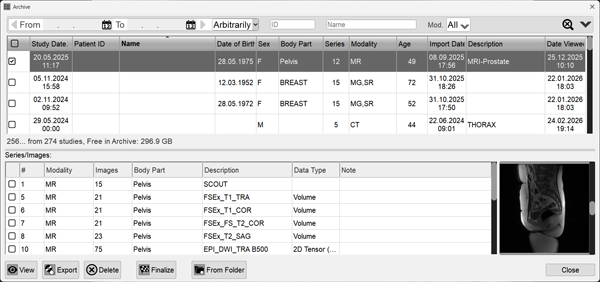 When a single study is selected, its series/images will be shown in the Series/Images table in the lower half of the window