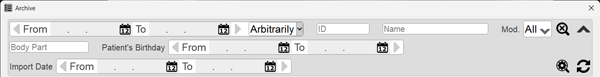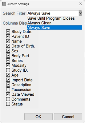 The window displays a list of all studies in the Archive, their count, and the remaining free space on the disk with images Note: With the Archive window open, clicking on a study title in the Preview Bar will indicate its location in the Archive