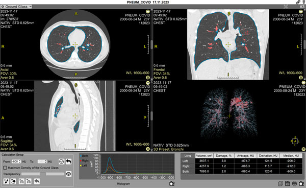 The "Ground Glass" program is designed to quantify dense areas in the lungs in the form of "ground glass":