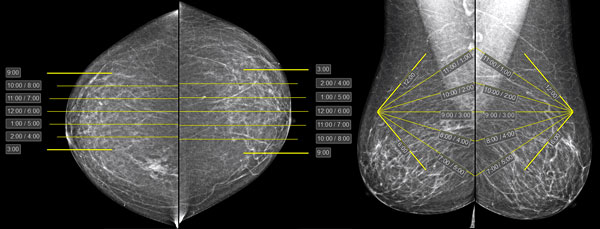 Clock-face sector markings will appear on the mammograms; they need to be adjusted to the specific study: