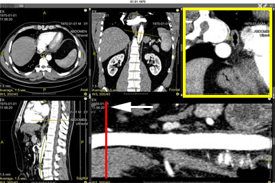 Displays, in addition to the resulting cMPR, orthogonal (cross-sectional) slices perpendicular to the construction curve