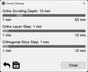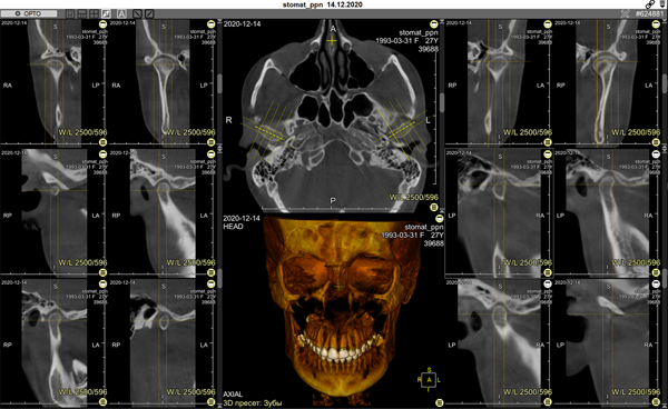 - axial scan, orthopantomogram, dental cross-sections, and 3D model, opens by default
