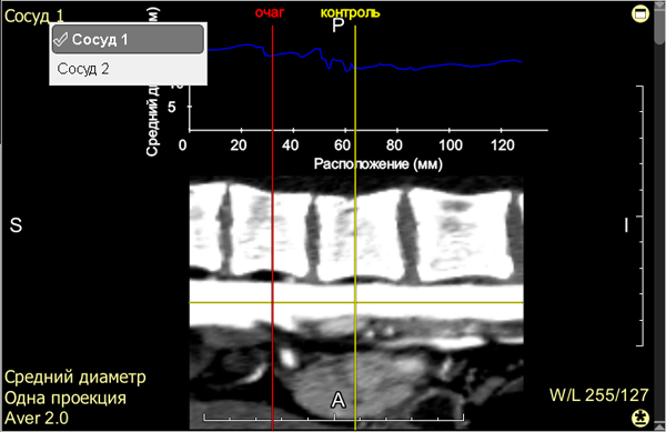 Move the yellow linear cursor ("Control") on the longitudinal view to an obviously "normal" vessel lumen area: