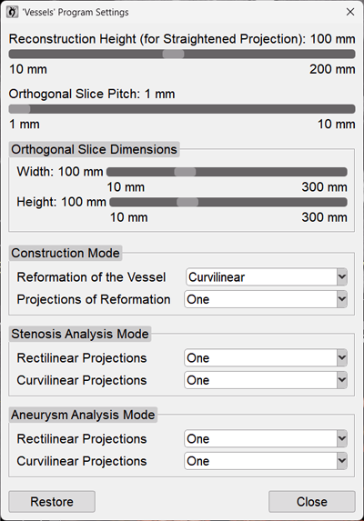Similar control of reconstructions and projections in the Vessel Analysis mode