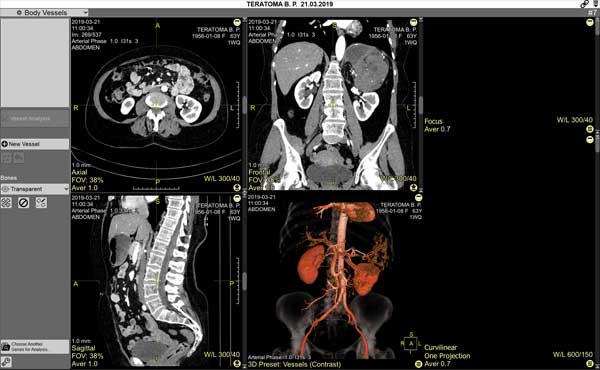 In case of a complex vessel configuration and close location of bones, it is better to construct the vessel's reference curve on axial scans (similar to cMPR)